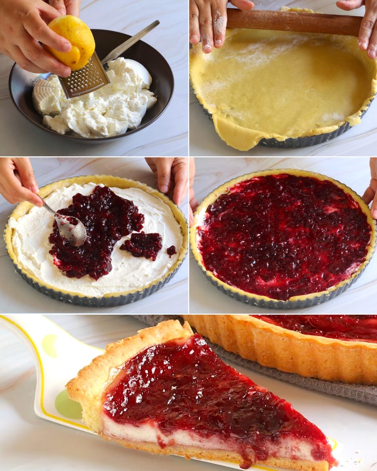 Ingredienti PER LA FROLLA FARINA TIPO 00 300 gr BURRO 150 gr ZUCCHERO SEMOLATO 120 gr UOVA 1 TUORLO 1 LIEVITO PER DOLCI 1 cucchiaino raso SCORZA DI LIMONE q.b. PER LA FARCITURA RICOTTA DI PECORA 400 gr CONFETTURA DI VISCIOLE 300 gr ZUCCHERO SEMOLATO 3 cucchiai SCORZA DI LIMONE q.b.